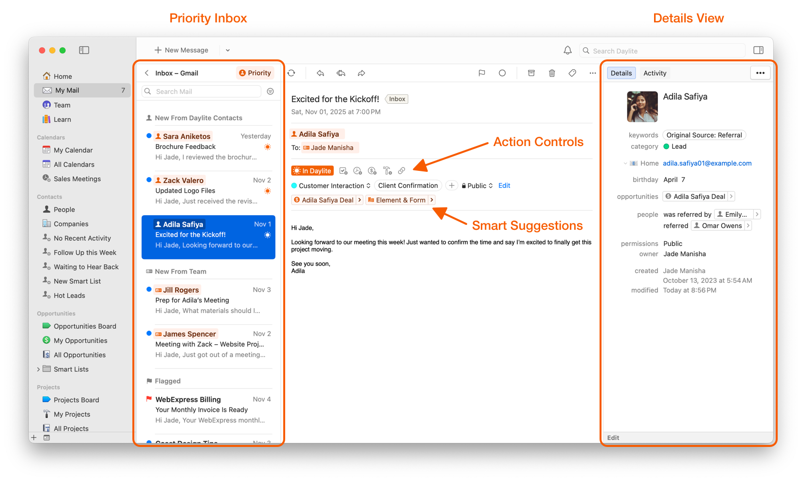 Die meisten Unternehmen verlassen sich auf mehrere Tools, darunter ein CRM, einen Projekt-Tracker, eine Aufgaben-App, einen Kalender und eine Notiz-App. Diese Trennung der Geschäftsdaten schafft Silos, die es schwierig machen, das Gesamtbild zu sehen. Daylite führt alles zusammen und verknüpft alle Informationen miteinander. Mit diesem Kontext macht Daylite Ihren Posteingang intelligenter, vernetzter und für Ihr Unternehmen unschätzbar wertvoll.